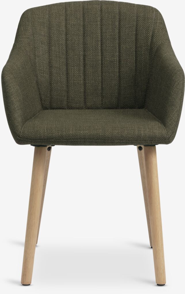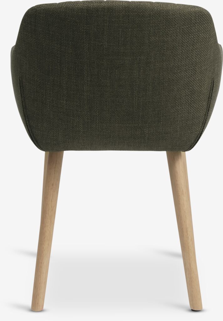 Étkezőszék karfákkal, amelyek további támaszt és kényelmet biztosítanak. A szék olívazöld szövettel párnázott ülő- és hátrésszel rendelkezik. Tömörfa lábak.