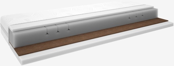 24 cm vastag habszivacs matrac 80x200 cm-es méretben, 5 komfortzónával, amelyek precíz, optimális alátámasztást nyújtanak a teljes testnek. Magja 1 cm jól szellőző kókuszrétegből, 19 cm poliéter habszivacsból és 3 cm nyomáskiegyenlítő hatású memory habszivacsból áll, amely precízen alkalmazkodik a test formájához. Mosható huzattal, amely az egyik oldalon azonnali hűsítő hatású SensICE szövetet tartalmaz.