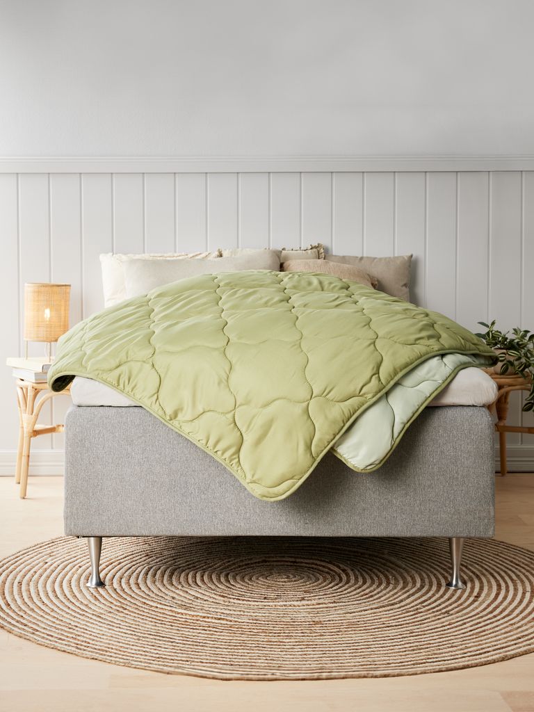 850 g szilikonizált spirálbolyhos poliészter üreges szál töltettel (100% újrahasznosított). Puha 100% poliészter mikroszálas huzattal. Mosás: 40°C. 200x220 cm