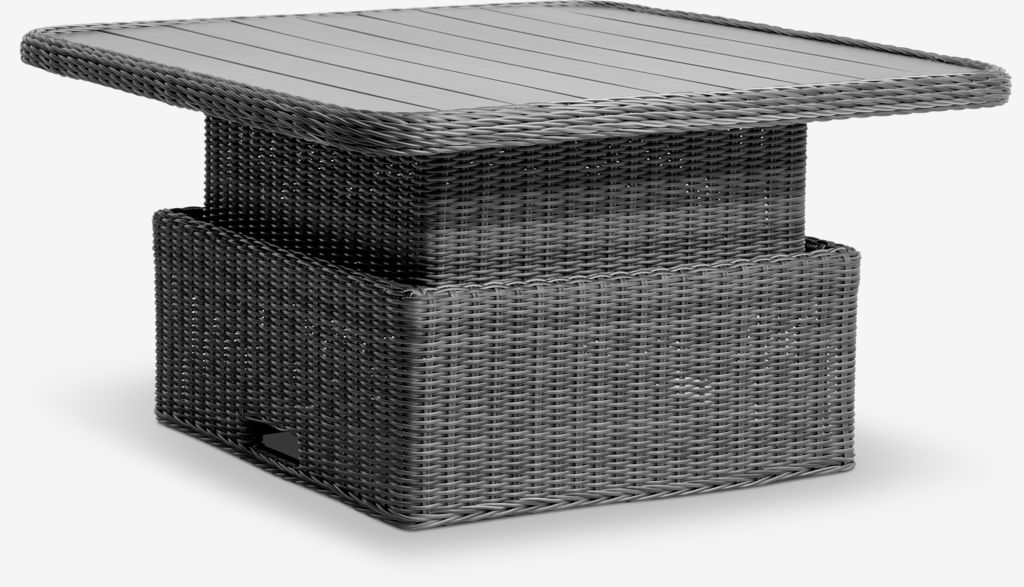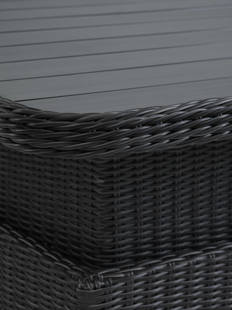 5-személyes ülőgarnitúra. Asztal: Alumínium, DURAWOOD® kompozit fa és polyrattan. A DURAWOOD® egy tartós kompozit anyag, amely FSC® keményfa rostból és műanyagból áll. Állítható magasságú. SZ121 x H121 x MA44/67 cm. 5-személyes kanapé: Alumínium és polyrattan. Nem fordítható meg. Luxus minőségű párnákkal, amelyek tartós, struktur-szövött huzattal rendelkeznek.