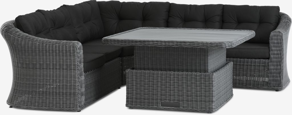 Solide møbler som tåler å stå ute vinterstid, så lenge man pakker dem godt inn. Like fine etter 6 år. God å sitte i, plass til mange og fordel med hev/senk på bord.