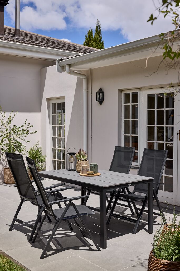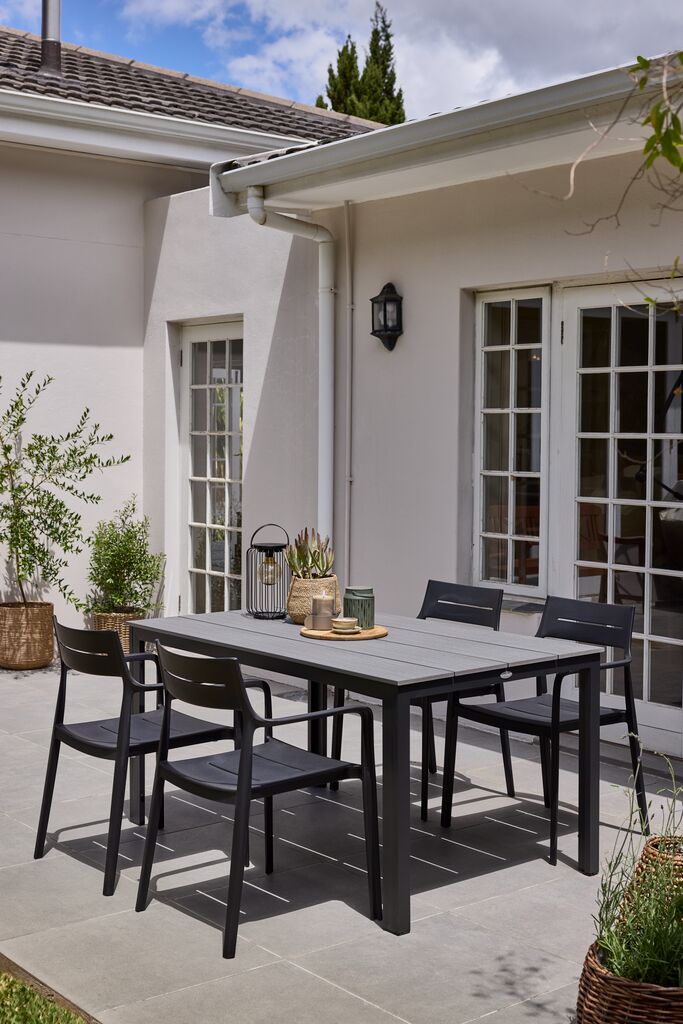 Szürke kerti asztal műfából készült asztallappal. Porfestett alumínium váz és lábak. A műfa megjelenése és textúrája a természetes fáé, karbantartást nem igényel. Az alumínium könnyű és robusztus anyag, amely nem rozsdásodik. SZ90 x H150 x MA74 cm