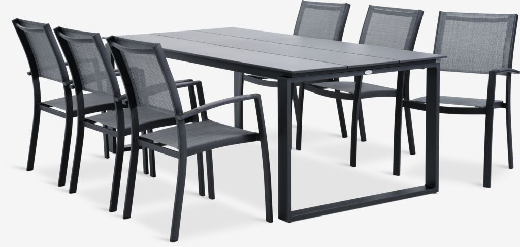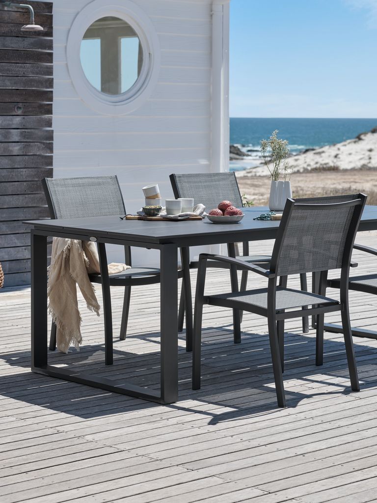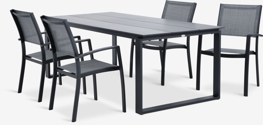 4-személyes kerti bútor garnitúra. Asztal: Alumínium és DURAWOOD® kompozit fa. A DURAWOOD® egy tartós kompozit anyag, amely FSC® keményfa rostból és műanyagból áll. SZ100 x H215 x MA75 cm. Szék: Alumínium és textilén. Rakásolható.
