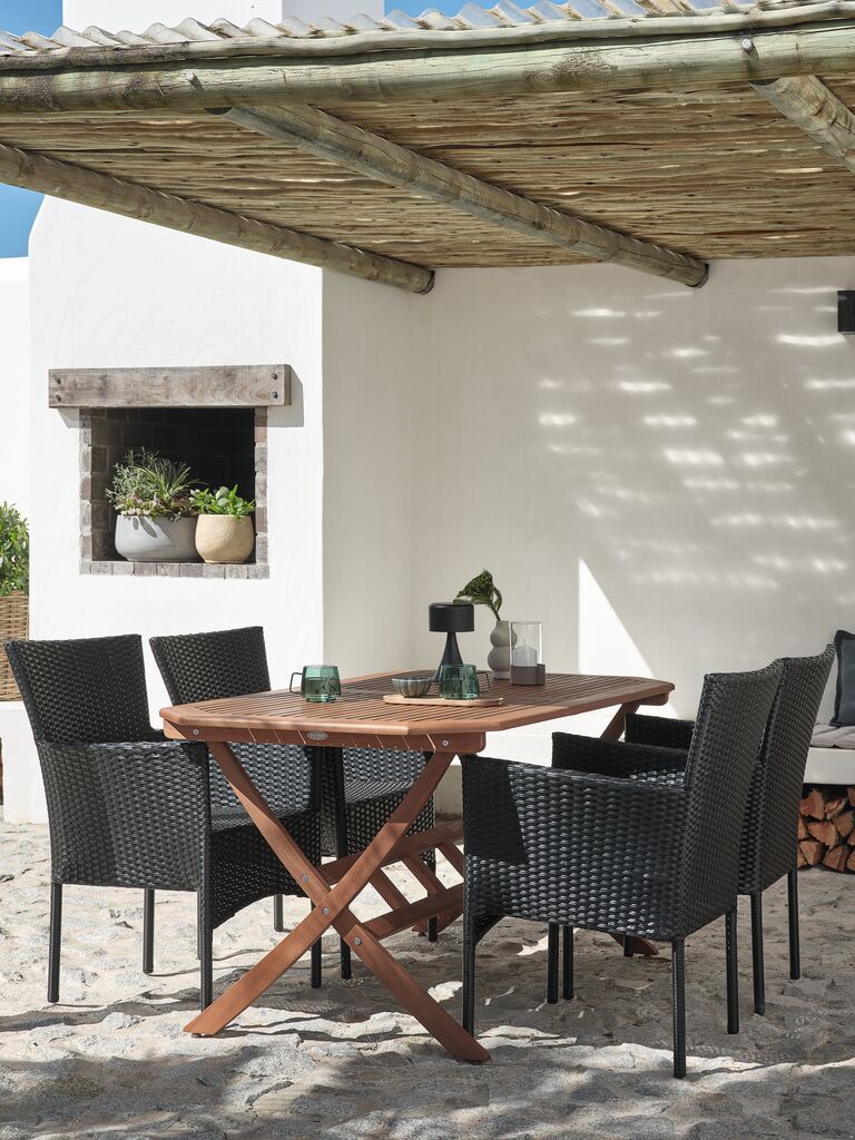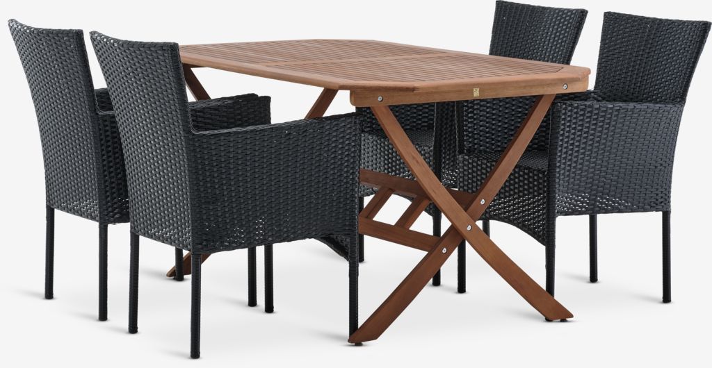4-személyes kerti bútor garnitúra. Asztal: Olajjal kezelt FSC® keményfa. SZ86 x H150 x MA75 cm. Szék: Acél és polyrattan. Rakásolható.