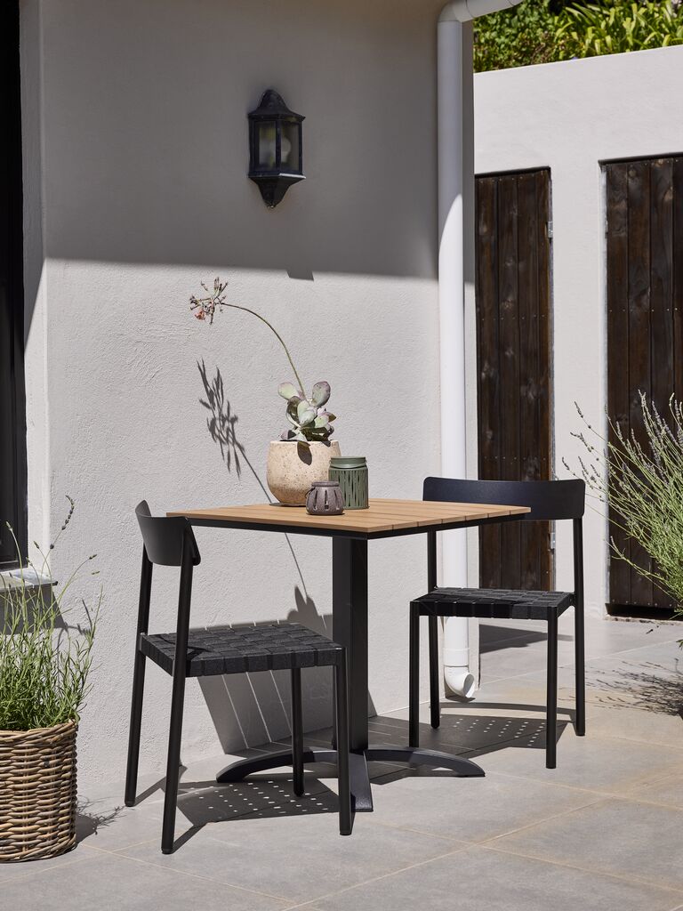 2-személyes kávéházi garnitúra. Asztal: Alumínium és műfa. SZ70 × H70 × MA73 cm. Szék: Alumínium és poliészter. Rakásolható.