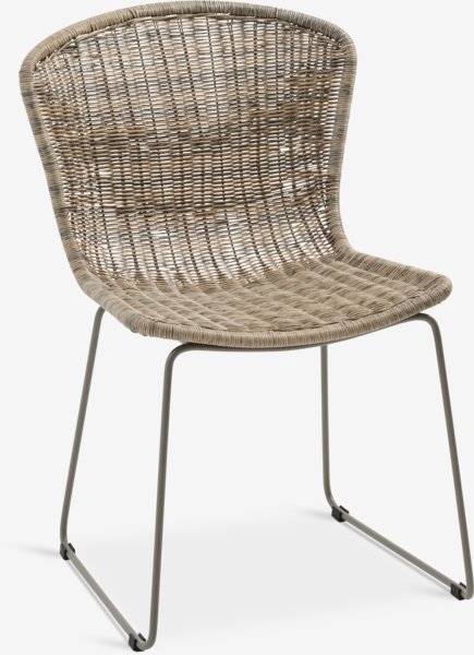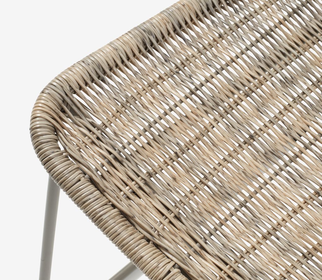 Kerti szék polyrattan üléssel és háttámlával, szürke színű porfestett acél lábakkal. A polyrattan természetes fonott megjelenést biztosít, ugyanakkor időjárásálló és karbantartásmentes.