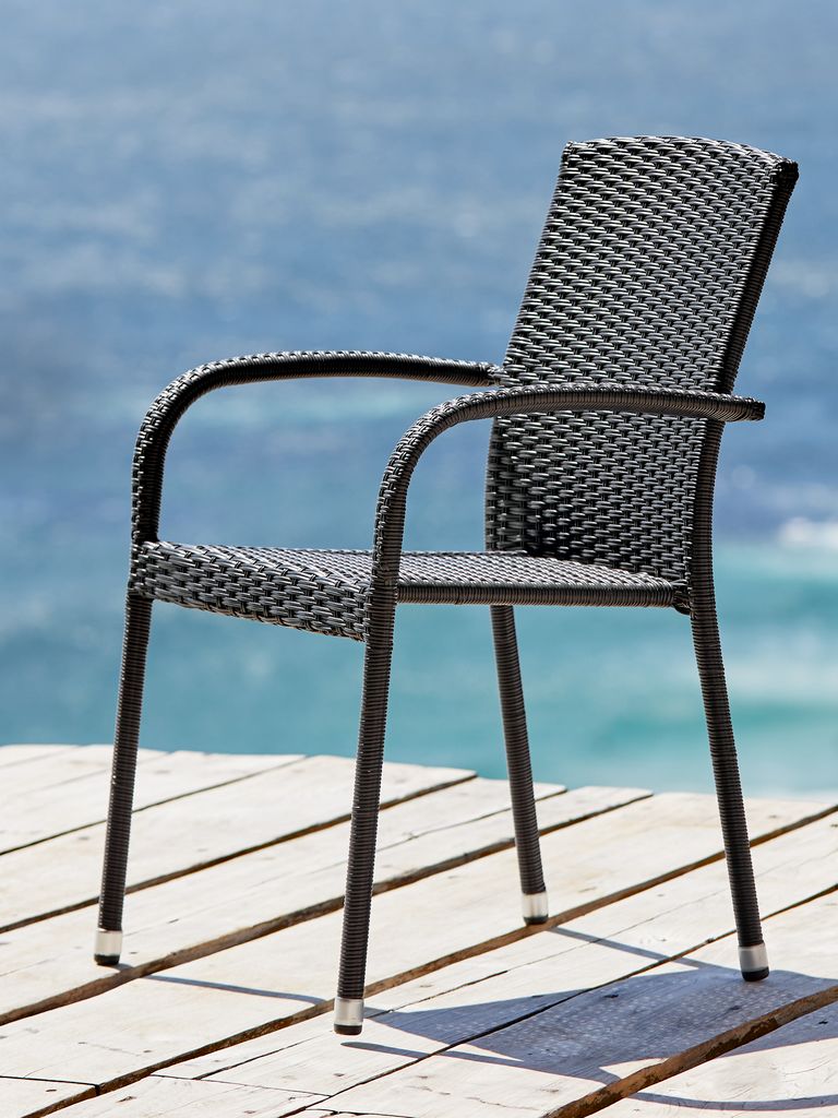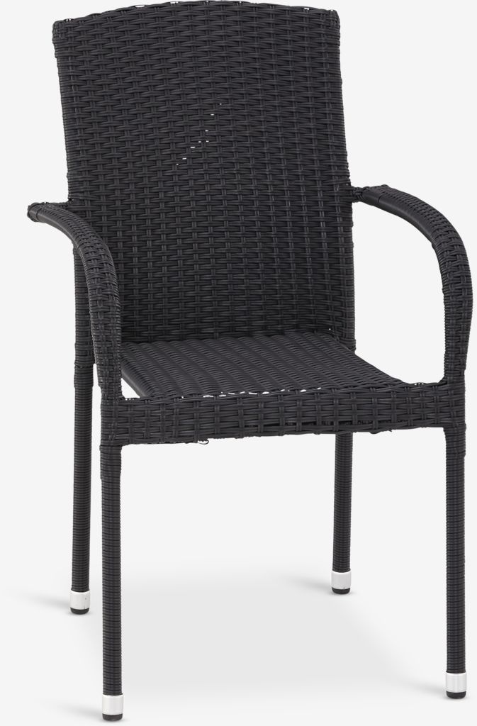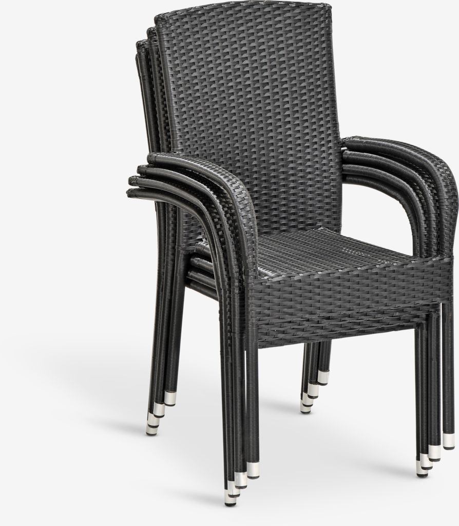 Fekete színű rakásolható kerti szék polyrattanból, porfestett acél vázzal. A polyrattan természetes fonott megjelenést biztosít, ugyanakkor időjárásálló és karbantartásmentes. A kerti szék egymásra rakásolható a kompakt tárolás érdekében.