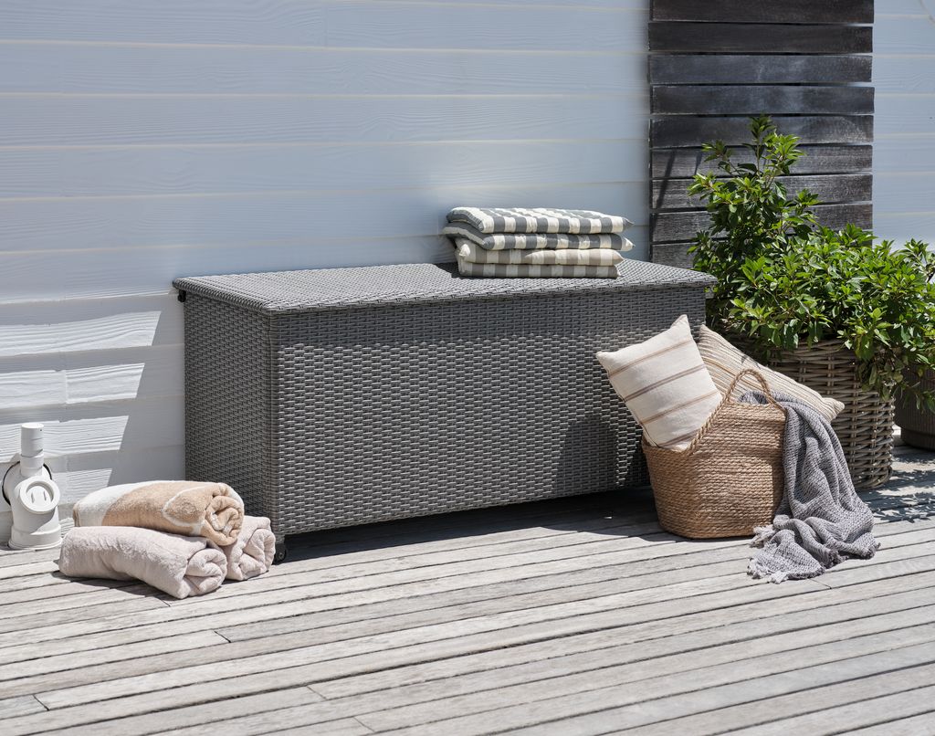 Μεγάλο μέγεθος χωράει όλα όσα ήθελα να κρύψω στη βεράντα. Ωραίο το σχέδιο ταιριαστό με το χώρο μου και τα ροδάκια βοηθάνε να το αποθηκεύω σε εσωτερικό χώρο αν το θελήσω. Το συνιστώ!