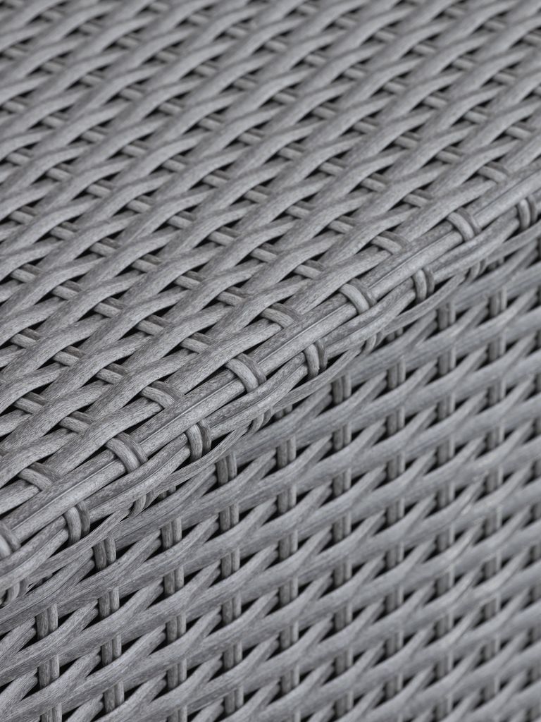 Párnatartó láda acélból és polyrattanból. Könnyen nyíló hidraulikus fedéllel, kerekekkel és húzó fogantyúval. SZ133 x MA64 x MÉ55 cm