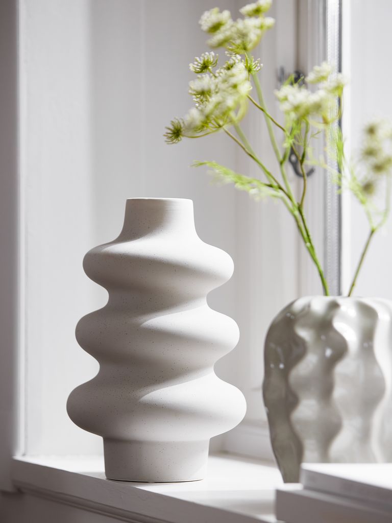 Fehér dolomit váza szoborszerű, lekerekített formával. Modern, organikus megjelenésű, alkalmas virágok bemutatására vagy önálló dísztárgyként is használható. ÁTM20 x MA30 cm