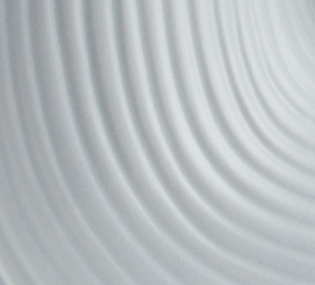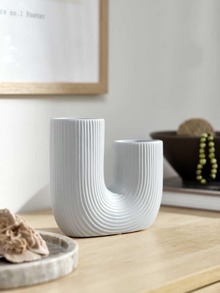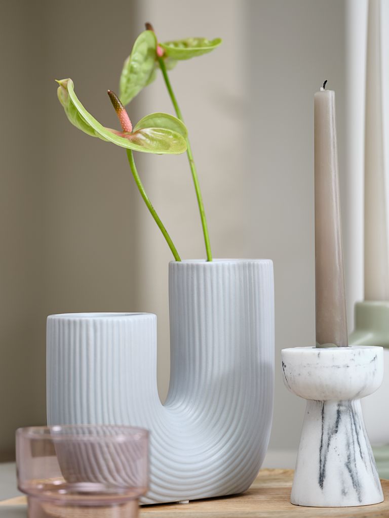 Világoskék váza kőből, modern és egyedi, U alakú kivitelben. A váza felülete finoman bordázott, ami textúrát és különleges megjelenést kölcsönöz neki. Ez a dekoratív darab tökéletes választás bármely beltéri környezet díszítésére. SZ18 x H6 x MA17 cm