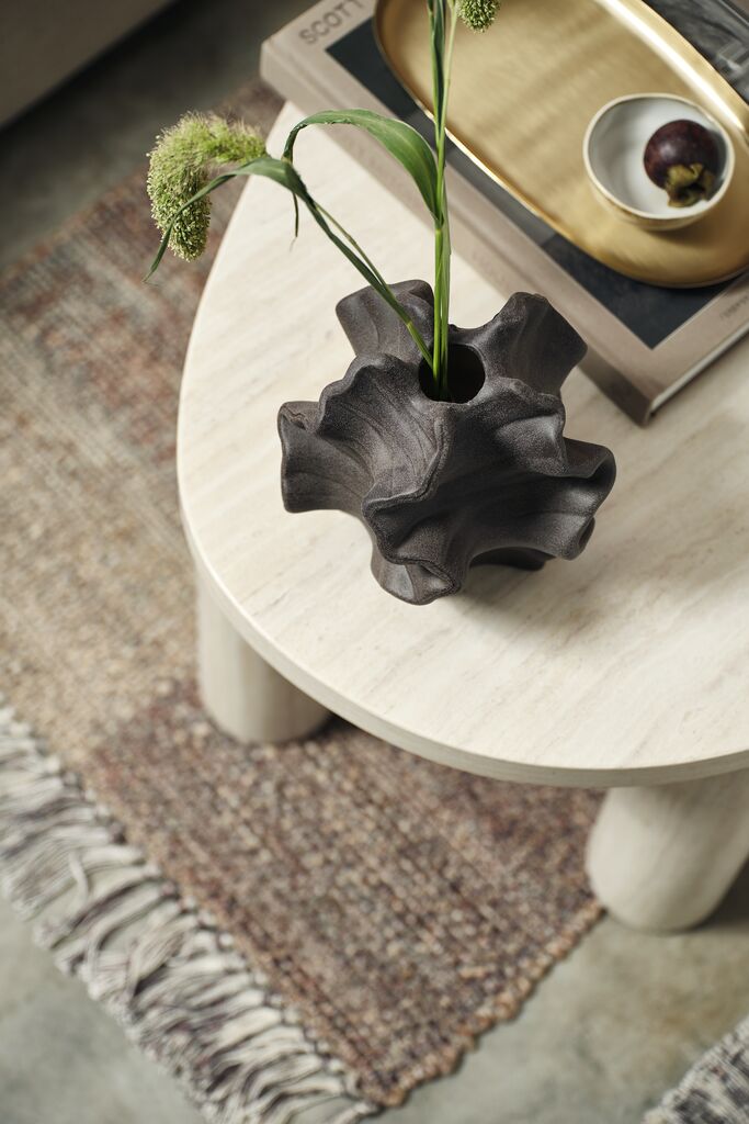 Sötétbarna cserép váza szoborszerű, organikus formával és texturált felülettel. Virágokhoz és önmagában, dísztárgyként is használható. SZ19 x H17 x MA18 cm