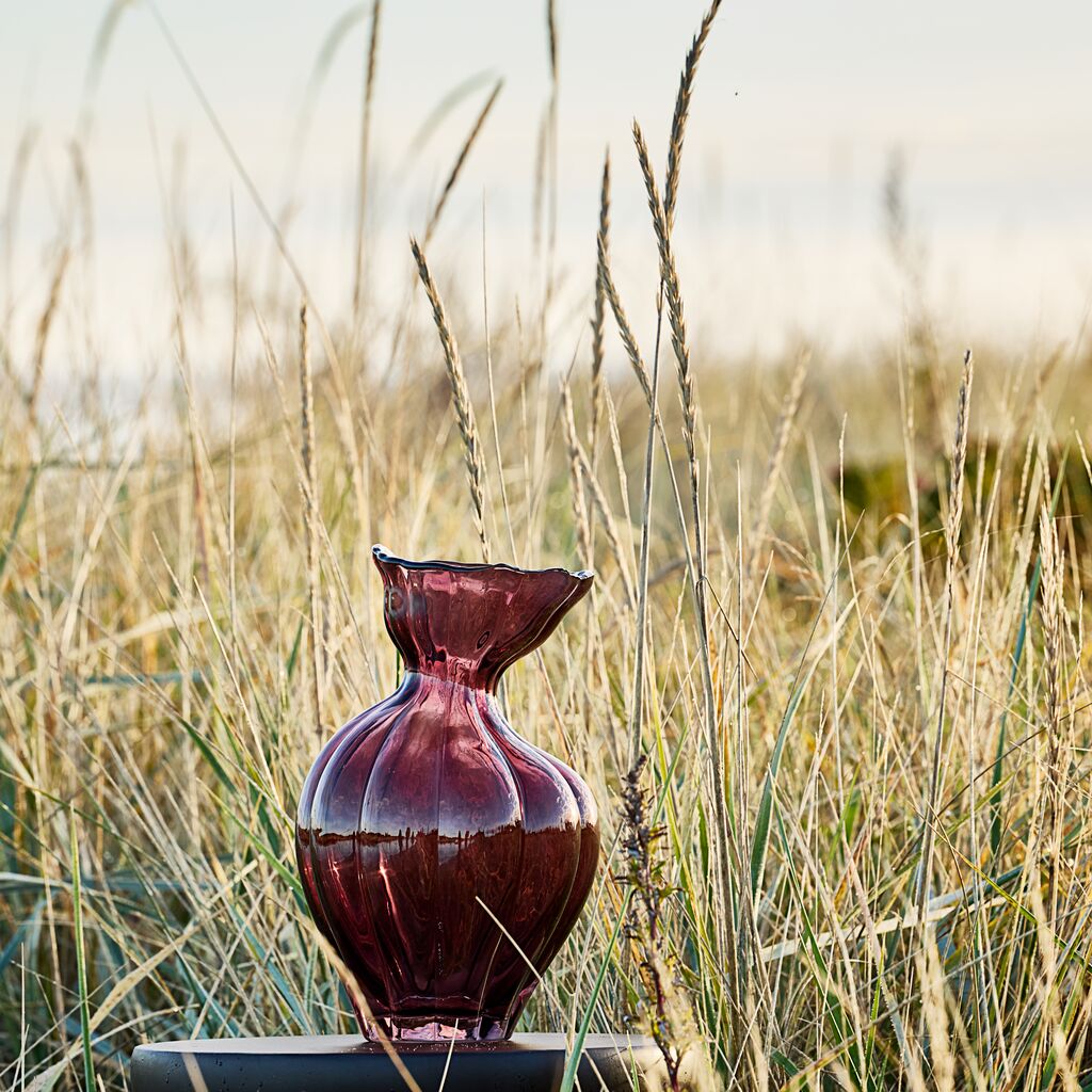 Padlizsánszínű üvegváza szoborszerű, bordázott dizájnnal. Az organikus forma alkalmas virágok bemutatására, vagy önálló dísztárgyként is használható. ÁTM19 x MA30 cm