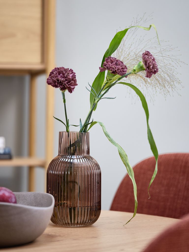 Barna színű váza üvegből, elegáns, bordázott textúrával. Klasszikus formája alkalmas virágok kiállítására, vagy önálló dísztárgyként is használható. ÁTM12 x MA21 cm
