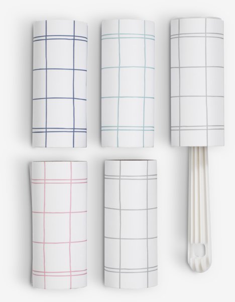 Szösztelenítő öt tekercs papírral, mindegyik 2,65 méter ragasztós papírral. Hatékonyan távolítja el a szöszöket és állati szőrt ruházatról és bútorokról. SZ17 x H32 x ÁTM4 x MA4 cm