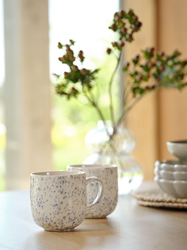 Bögre kőből, kék és fehér pöttyös mintázattal, amely kiegészíti a modern étkezési asztalokat. Kiváló kávéhoz vagy teához. Mosogatógépben mosható. 40 cl űrtartalmú. ÁTM9 x MA9 cm